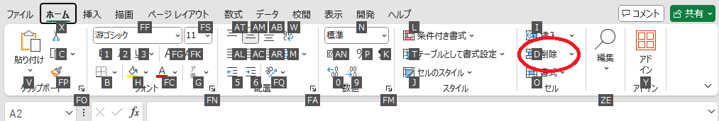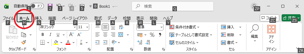 各キーは同時に押すのではなく、順番に一つずつ押していきます。Altキーを押すとリボンにアクセスキーが表示されるため、それに従ってキーを押していく形です。