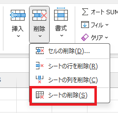 また、シートを選択してから「ホーム」タブの「削除」ボタンをクリックし、「シートの削除」を選択する方法もあります。