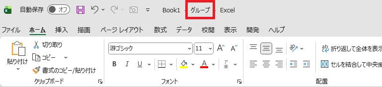 複数のシートが選択された状態になります。選択されたシートタブは白く表示され、タイトルバーには「[グループ]」と表示されるでしょうか?