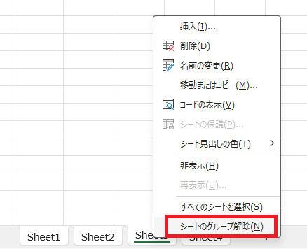 シート選択を解除するには、選択されていないシートタブをクリックするか、選択されているシートタブを右クリックして「シートのグループ解除」を選択します。