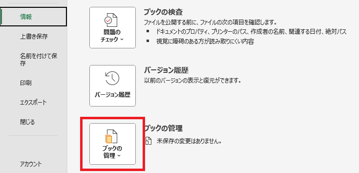 「ファイル」タブ→「情報」→「ブックの管理」→「保存されていないブックの回復」から、自動保存されたファイルを確認してください。