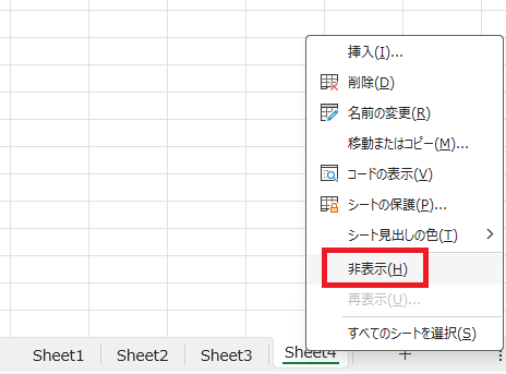 非表示にしたシートは、シートタブを右クリックして「再表示」を選択することで、いつでも元に戻せます。