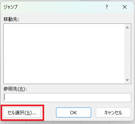 表示されるメニューから「条件を選択してジャンプ」を選択しましょう。または、F5キーを押してから「セル選択」ボタンをクリックすることでも同じダイアログを開けます。