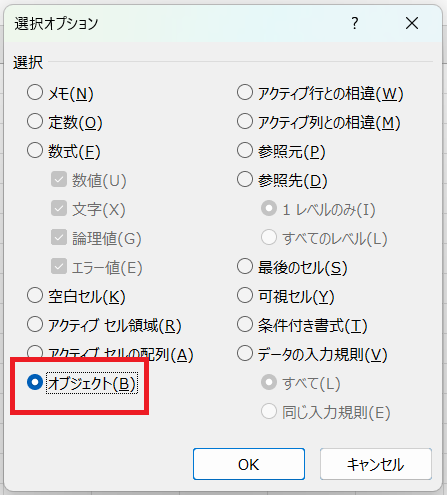 「選択オプション」ダイアログボックスが表示されたら、「オブジェクト」を選択して「OK」をクリックしてください。