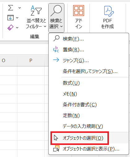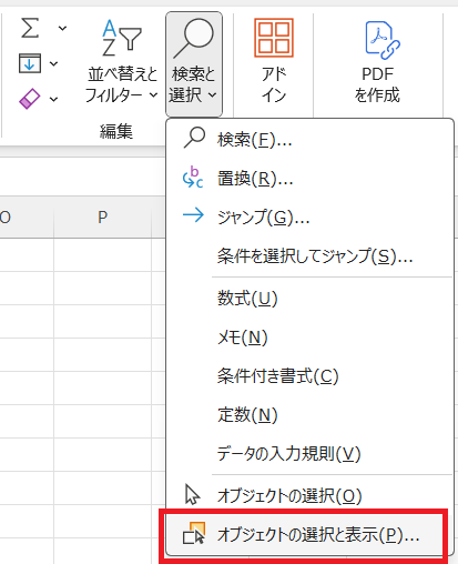 メニューから「オブジェクトの選択と表示」を選択してください。