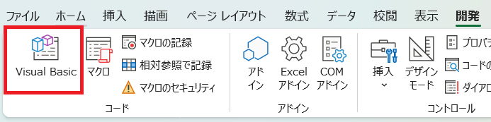 「開発」タブをクリックして、「Visual Basic」ボタンをクリックしましょう。