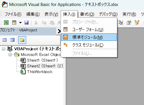 VBAエディタが開いたら、「挿入」メニューから「標準モジュール」を選択します。