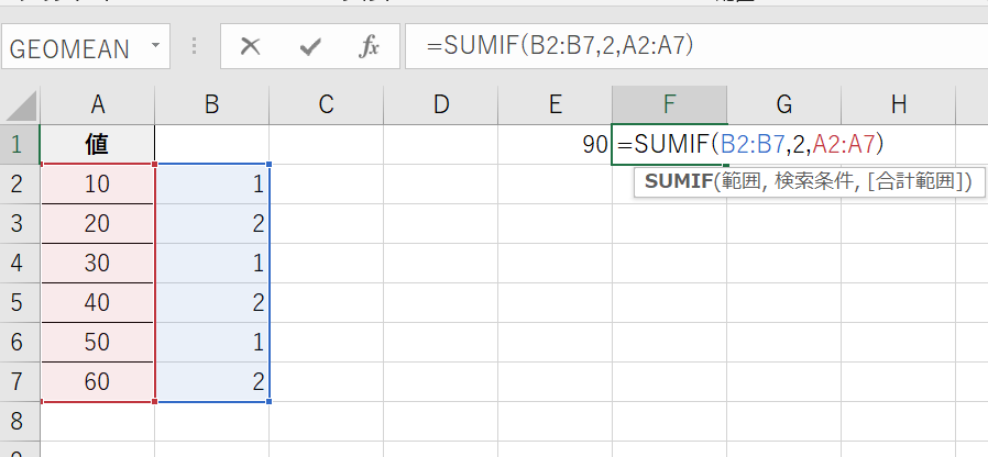 結果として90(10+30+50)が表示され、番号1のデータのみが合計されました。