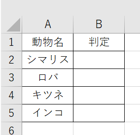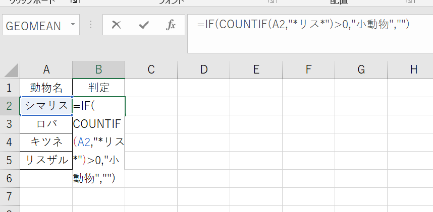 =IF(COUNTIF(A2,”*リス*”)>0,”小動物”,IF(COUNTIF(A2,”*ロバ*”)>0,”家畜”,IF(COUNTIF(A2,”*キツネ*”)>0,”野生動物”,IF(COUNTIF(A2,”*インコ*”)>0,”鳥類”,”その他”))))