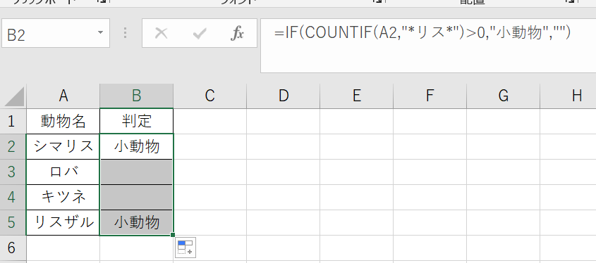 =IF(COUNTIF(A2,”*リス*”)>0,”小動物”,””)