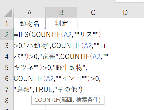 =IFS(COUNTIF(A2,”*リス*”)>0,”小動物”,COUNTIF(A2,”*ロバ*”)>0,”家畜”,COUNTIF(A2,”*キツネ*”)>0,”野生動物”,COUNTIF(A2,”*インコ*”)>0,”鳥類”,TRUE,”その他”)