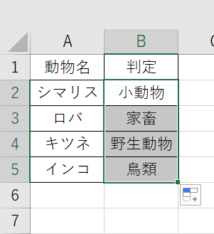 数式を下方向にコピーすれば、「シマリス」と「リスザル」に「小動物」と表示されます。