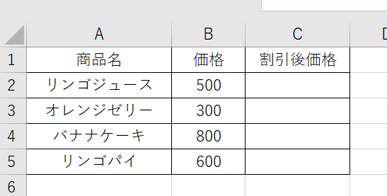 数式を下方向にコピーすれば、「リンゴジュース」と「リンゴパイ」だけが割引された価格で表示されます。