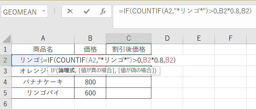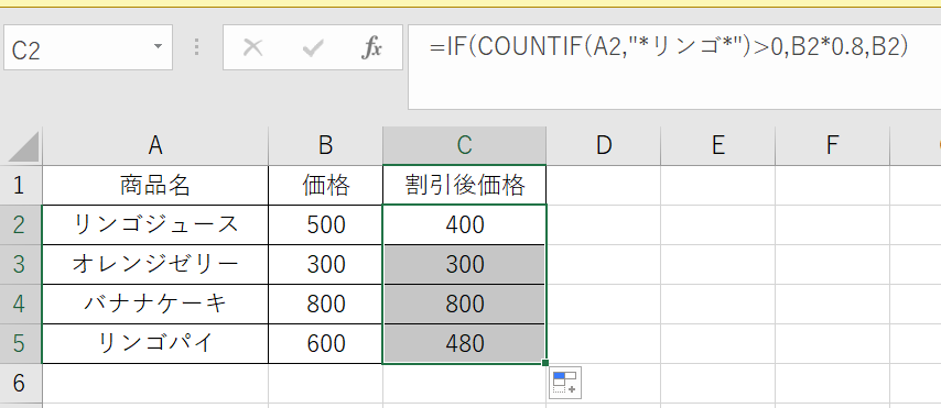 =IF(COUNTIF(A2,”*リンゴ*”)>0,B2*0.8,IF(COUNTIF(A2,”*バナナ*”)>0,B2*0.9,B2))