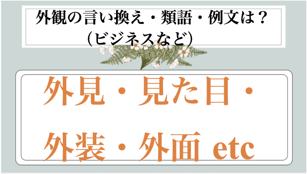 この記事では、外観|別の言い方に言い換え(ビジネス|別の言い方|例文|丁寧なメール|敬語)【目上や上司や部下など】について解説していきます。