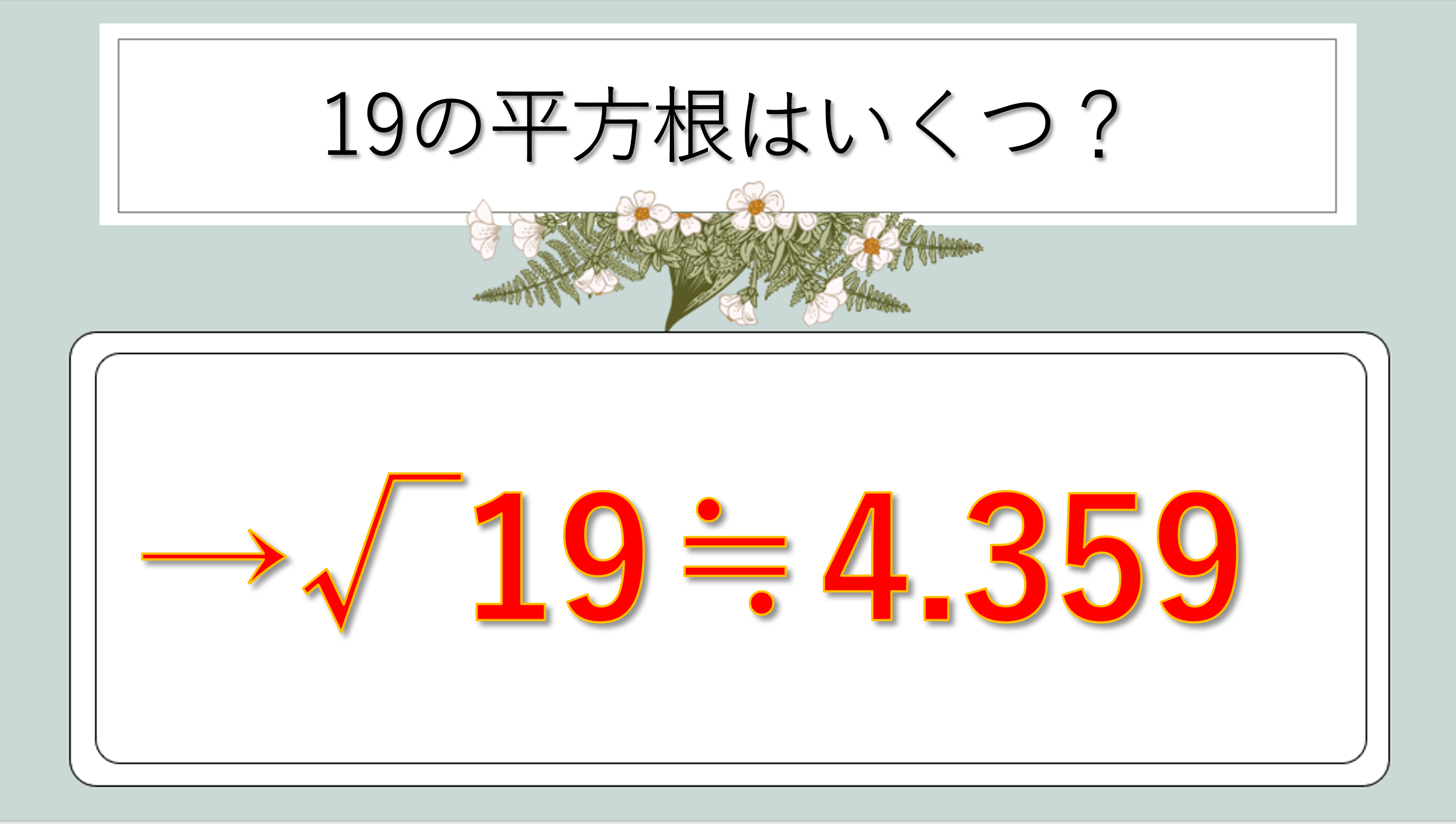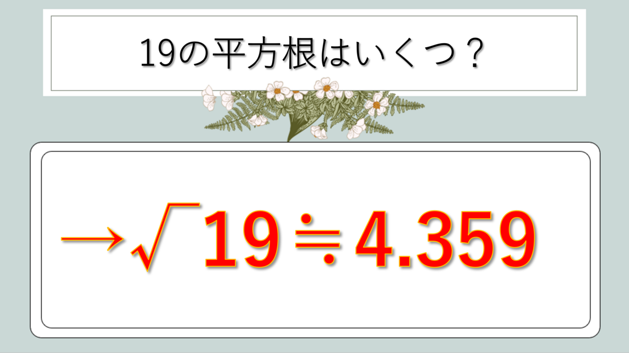 平方根とは、2乗するとその数になる値のこと。つまり√19は「2乗すると19になる数」を意味します。