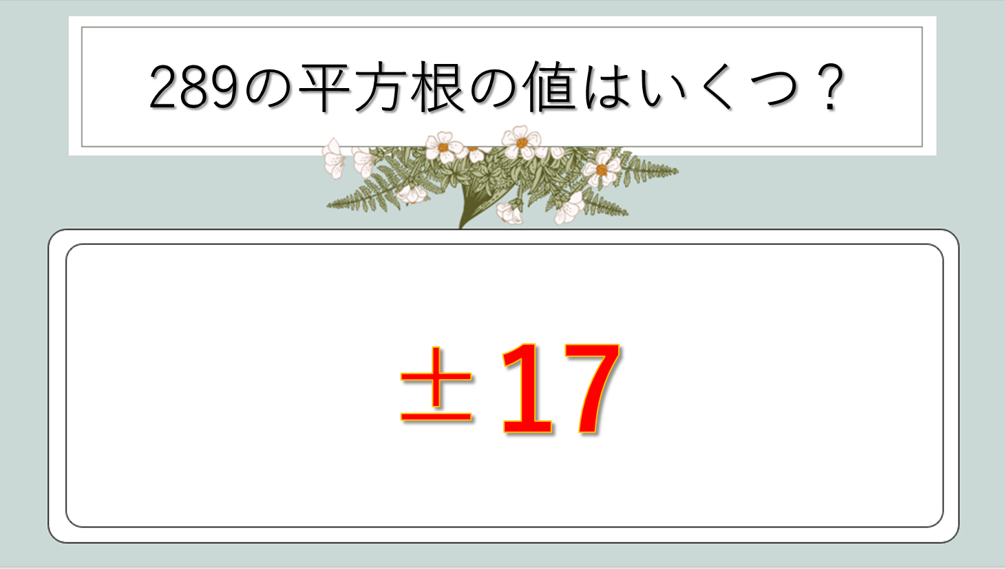 【問題】正方形の面積が289cm²のとき、一辺の長さは?