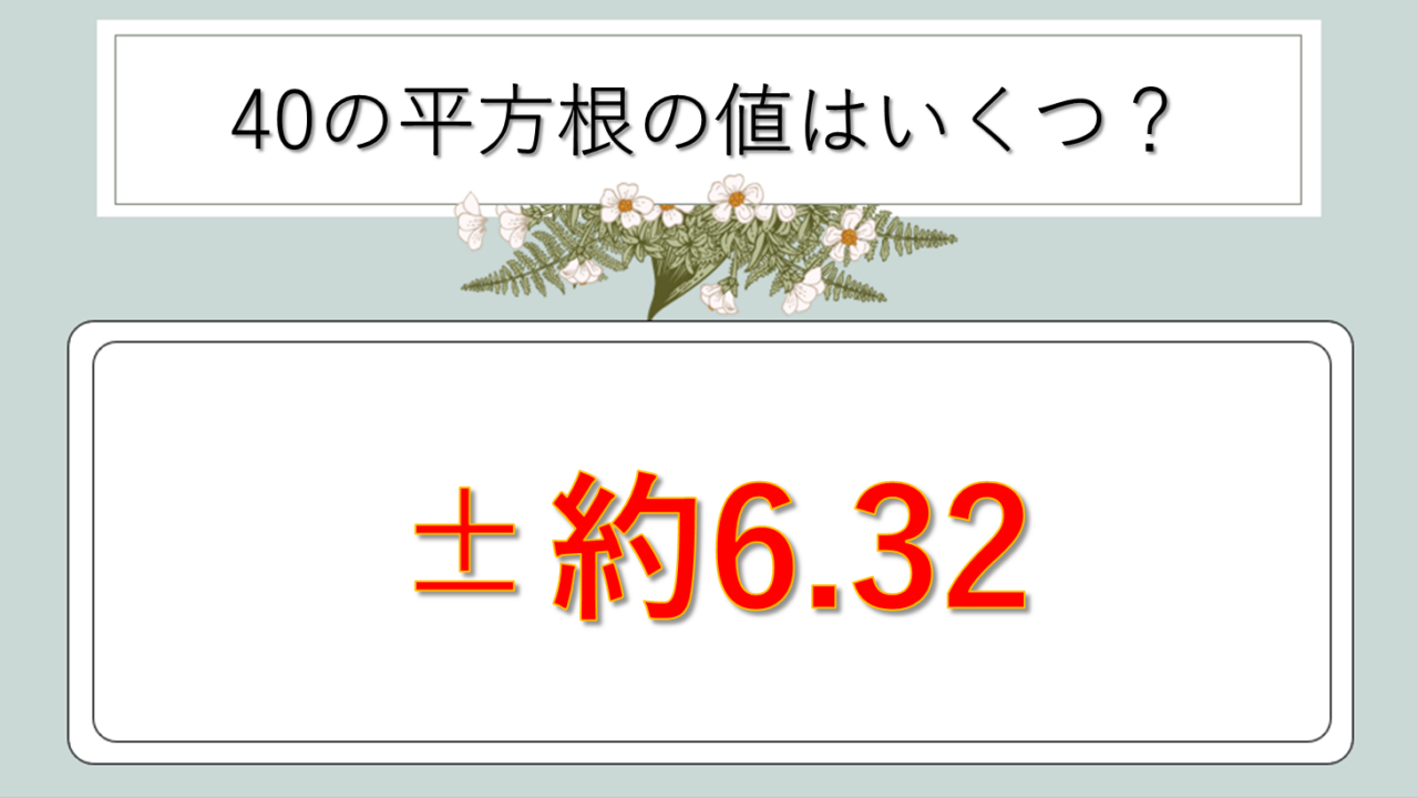 40に近いのは6.32の方。したがって√40 ≈ 6.32という近似値が得られます。