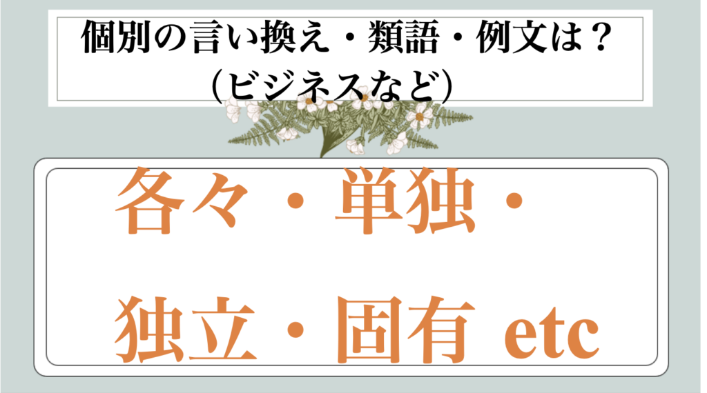 この記事では、個別|別の言い方に言い換え(ビジネス|別の言い方|例文|丁寧なメール|敬語)【目上や上司や部下など】について解説していきます。