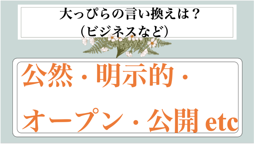 まとめ 大っぴらの類語|ビジネス|言い換え|丁寧な言い方|優しい言い方|敬語)【目上や上司や部下など】
