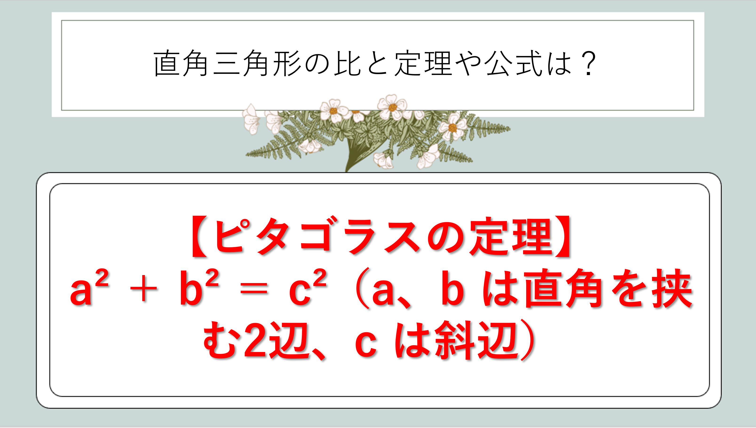 それではまず、直角三角形の最も基本となる定理と、辺の比の全体像について解説していきます。