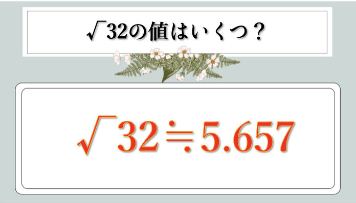 また、√2 ≒ 1.414を「一夜一夜に人見頃(ひとよひとよにひとみごろ)」で覚えている方は、それを4倍すれば√32の値が得られることを関連付けて記憶するのも効果的です。