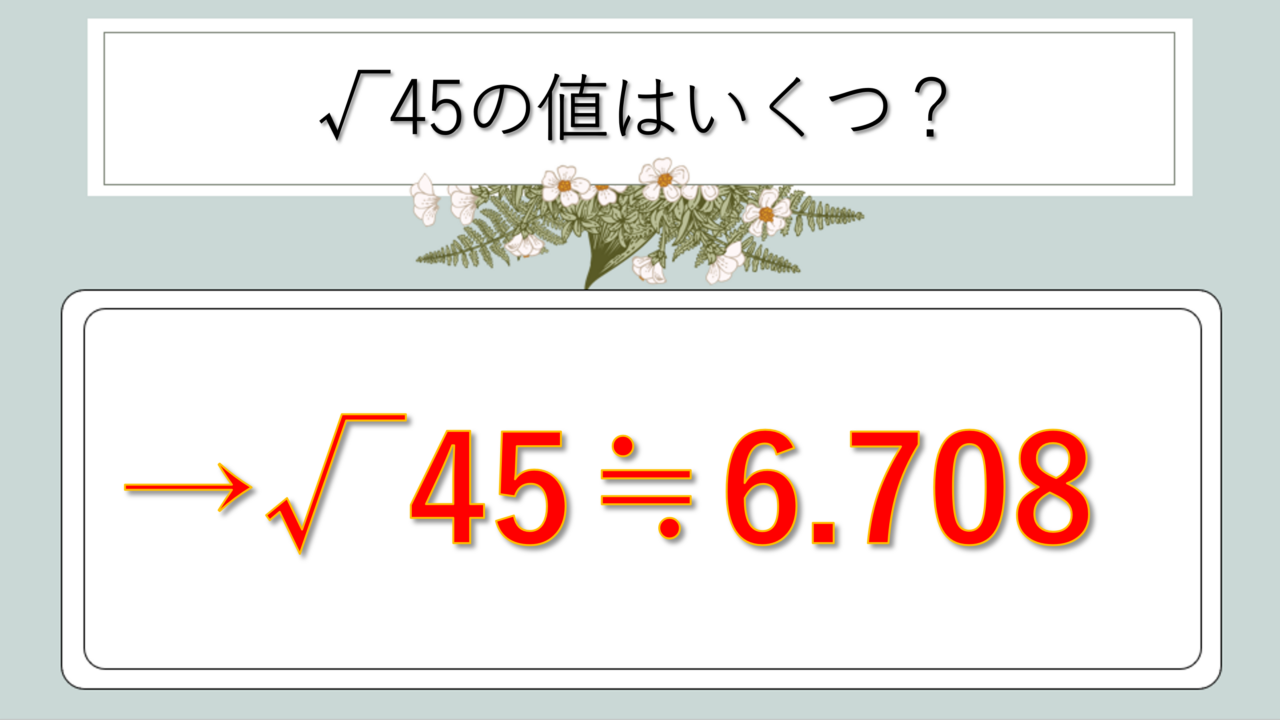 45は36より9大きいため、ルート45はルート36(つまり6)よりかなり大きい値になることが直感的にわかるでしょう。