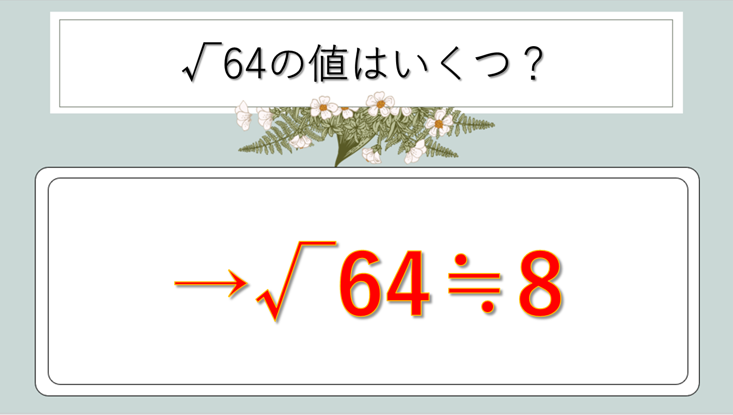 このように、ルート64=8という値を知っていれば、様々な計算がスムーズに進められます。