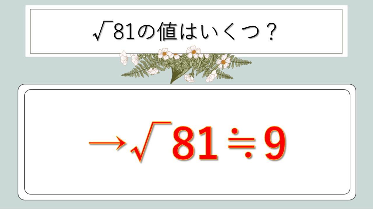 なぜ9なのか。それは9×9=81という関係があるためです。平方根とは「2乗するとその数になる値」を意味しており、9を2乗すると81になることから、81の平方根は9となるわけです。