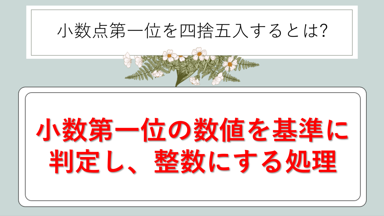 小数点第一位を四捨五入するとは、小数第一位の数値を基準に判定し、整数にする処理を指します。つまり、小数第一位が5以上であれば整数部分を1繰り上げ、4以下であれば整数部分はそのまま残すということです。