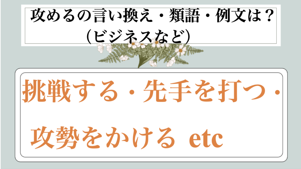 この記事では、攻める|別の言い方に言い換え(ビジネス|別の言い方|例文|丁寧なメール|敬語)【目上や上司や部下など】について解説していきます。
