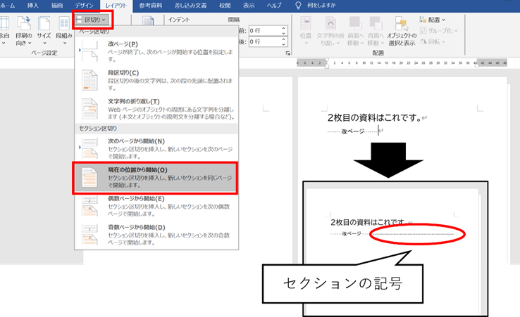 通常、入れたセクション区切りは見えないので編集記号の表示で確認してください。